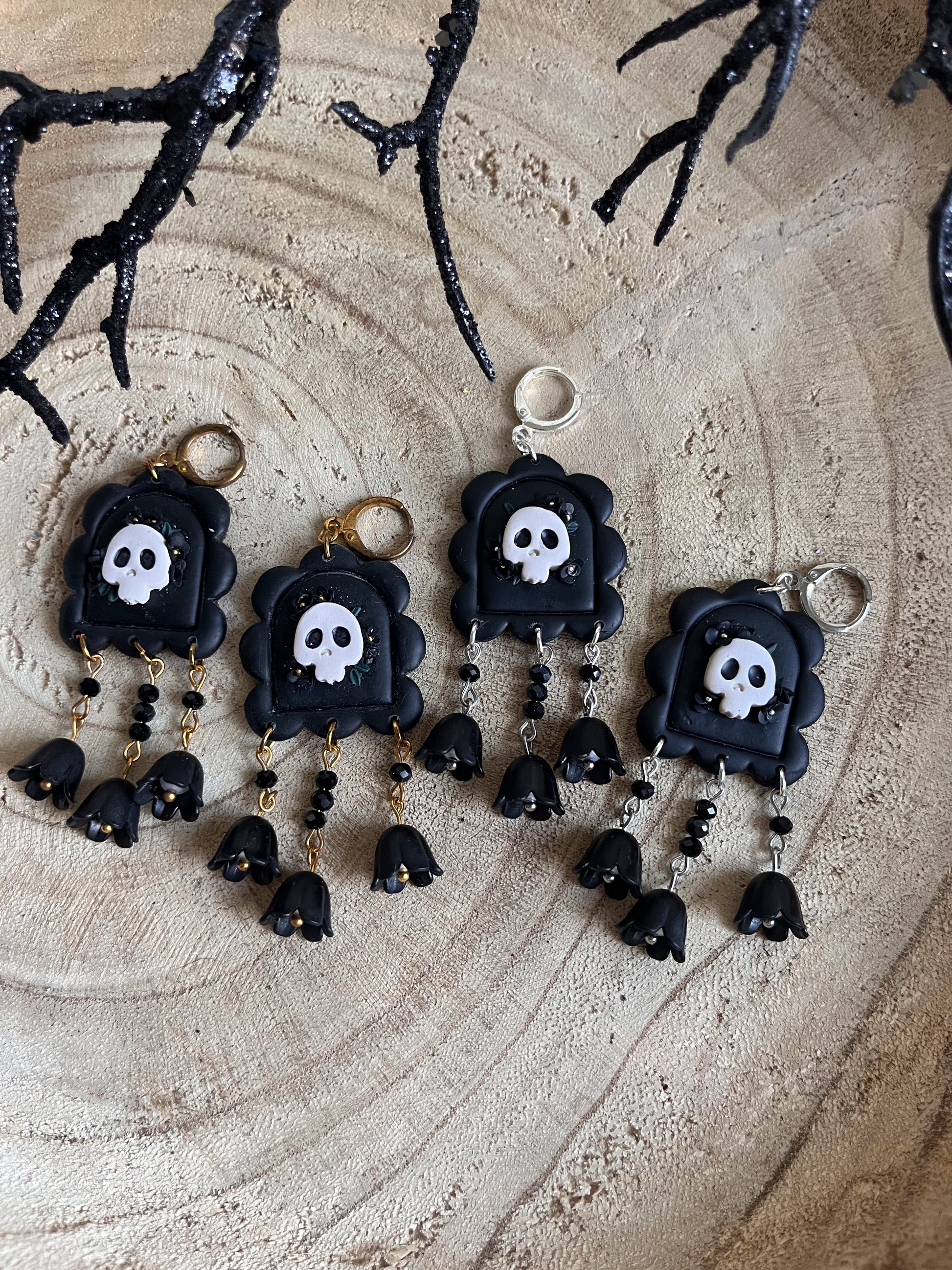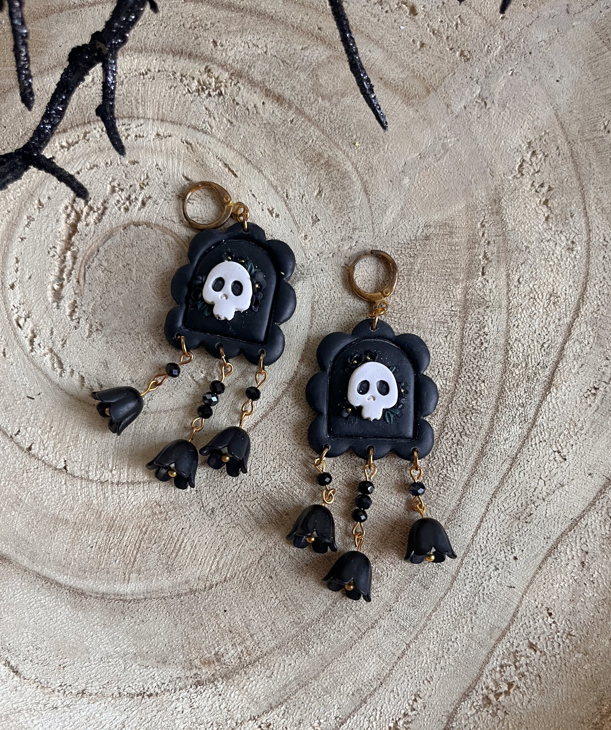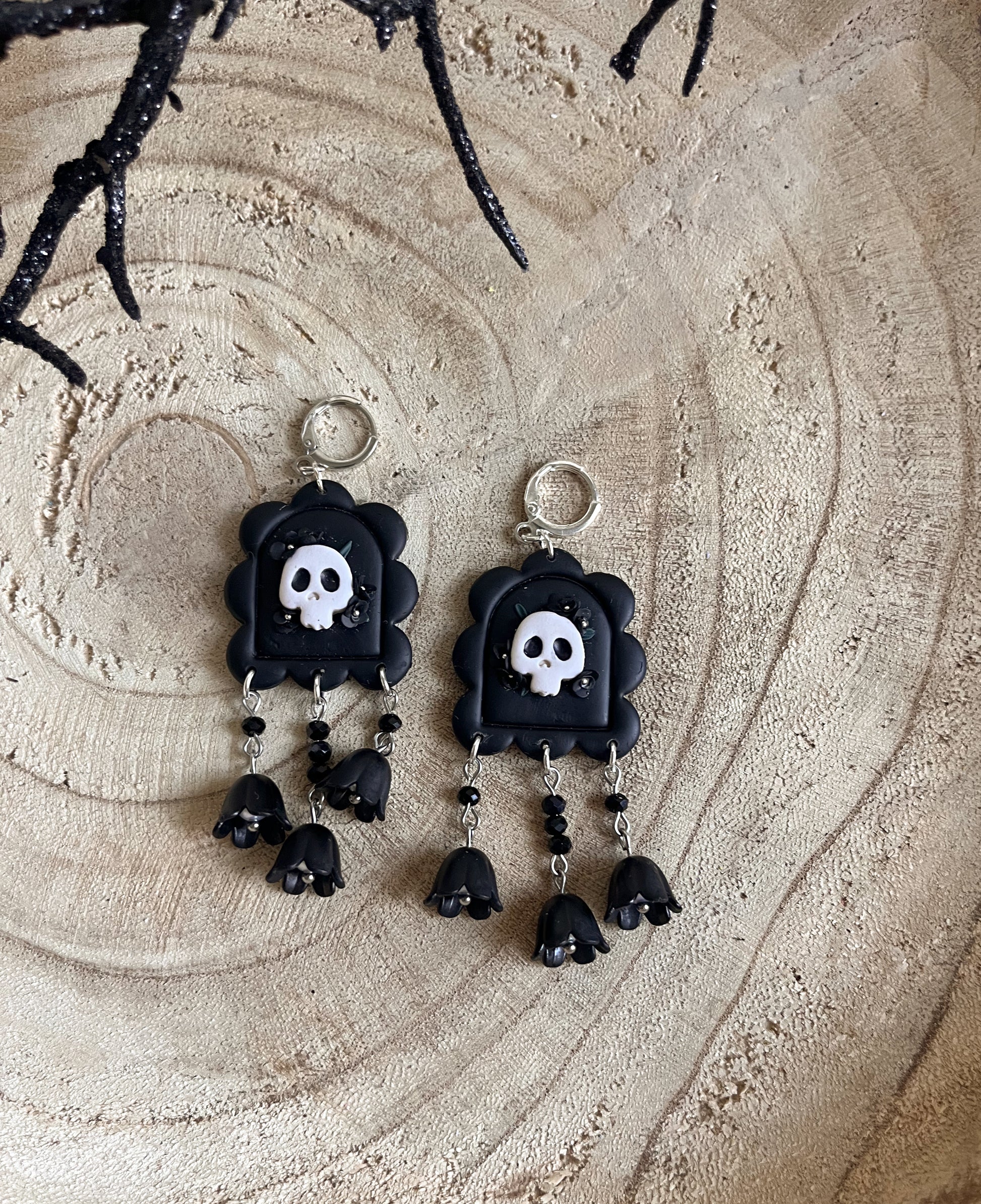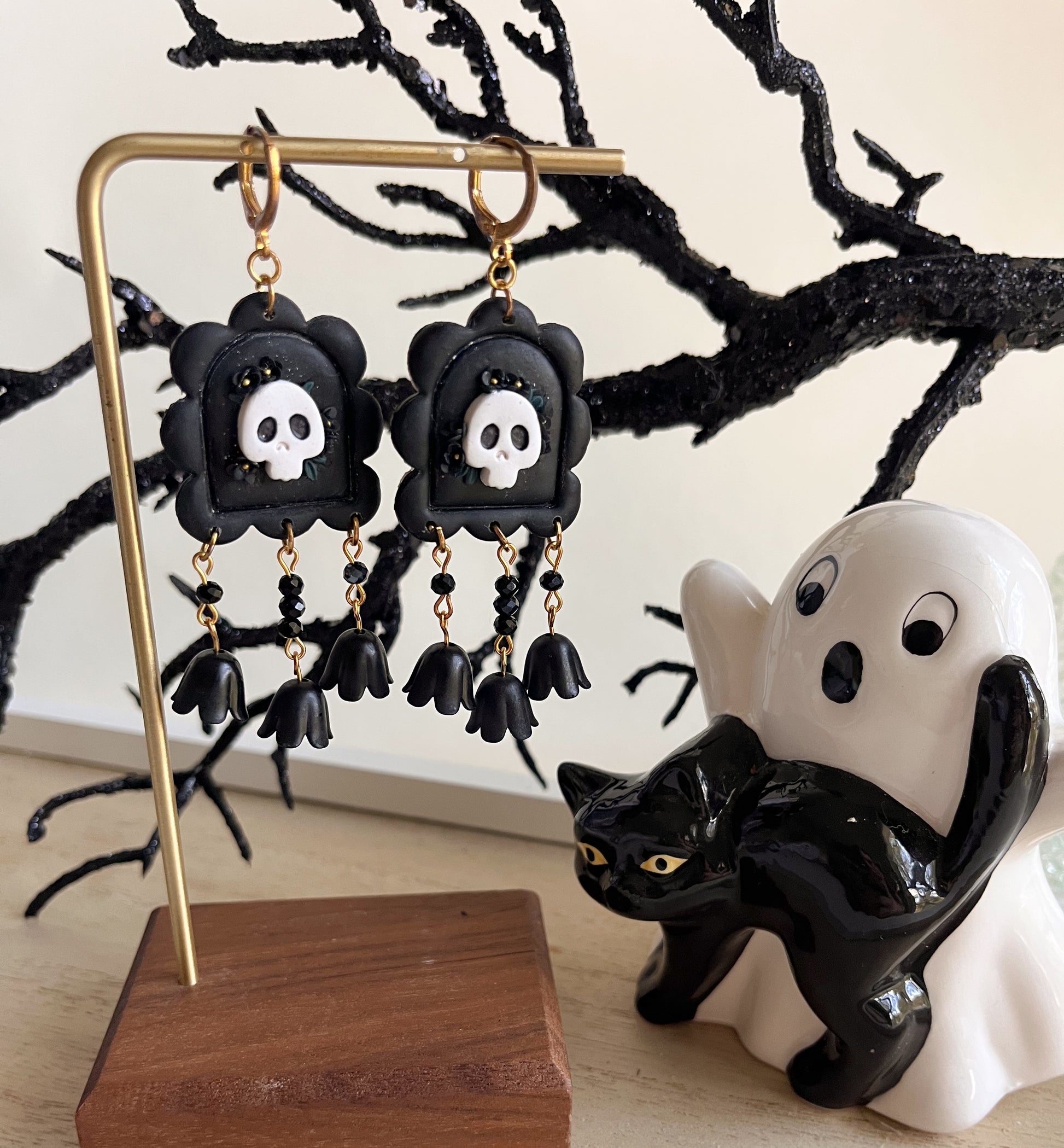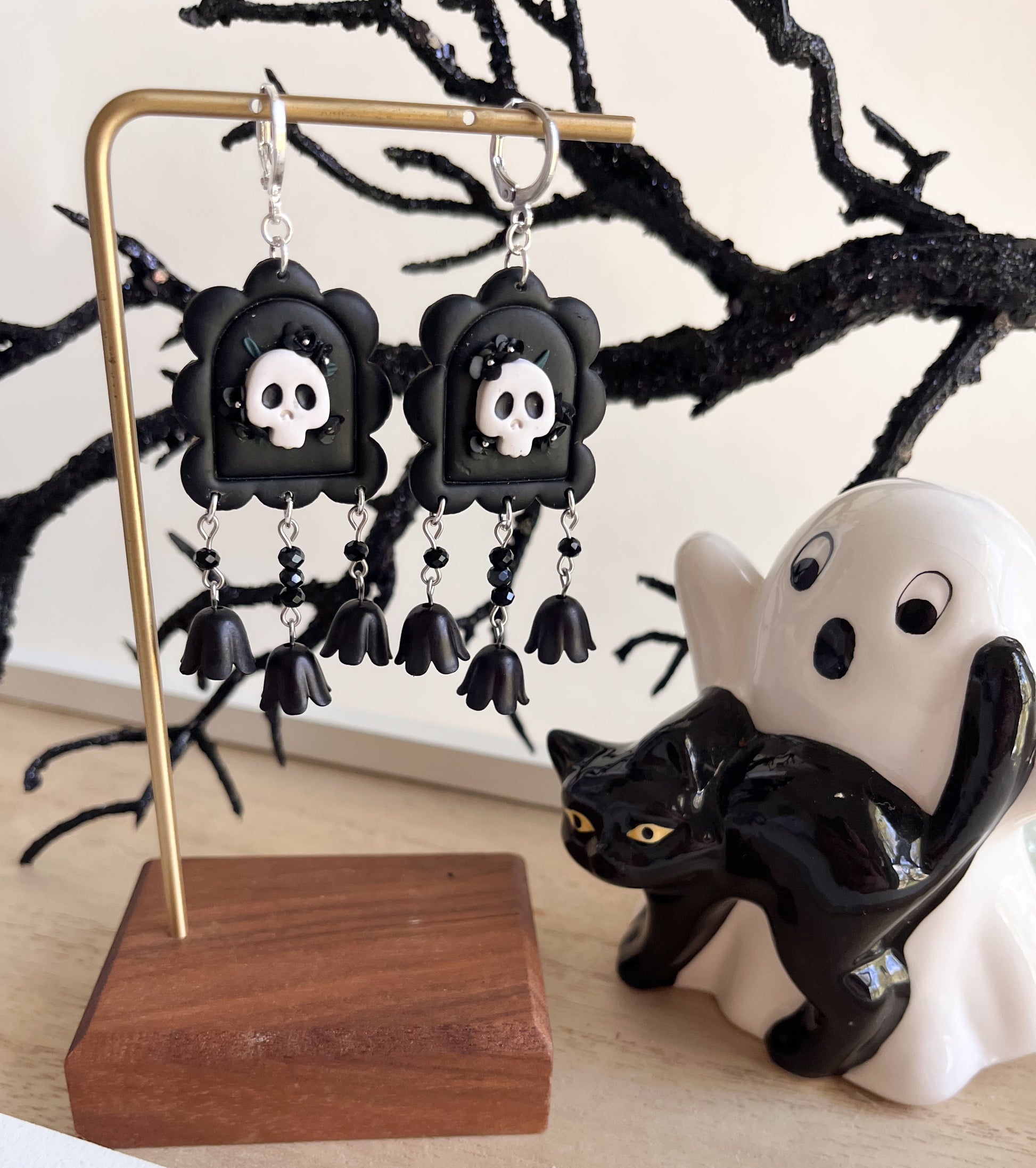 My favorite pair of earrings to date. These are so fun to make and so beautiful! Featuring a skull with black florals, sparkly beads and matte black bell flower accents. Does a more perfect pair of Halloween earring exist? Available in either gold or silver (plated).