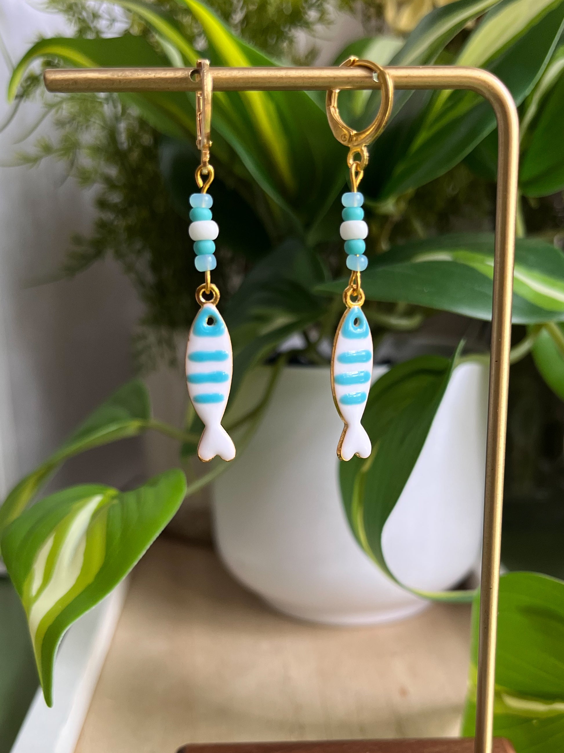 Sweet and dainty earrings featuring a fish charm and blue beaded "bobber"