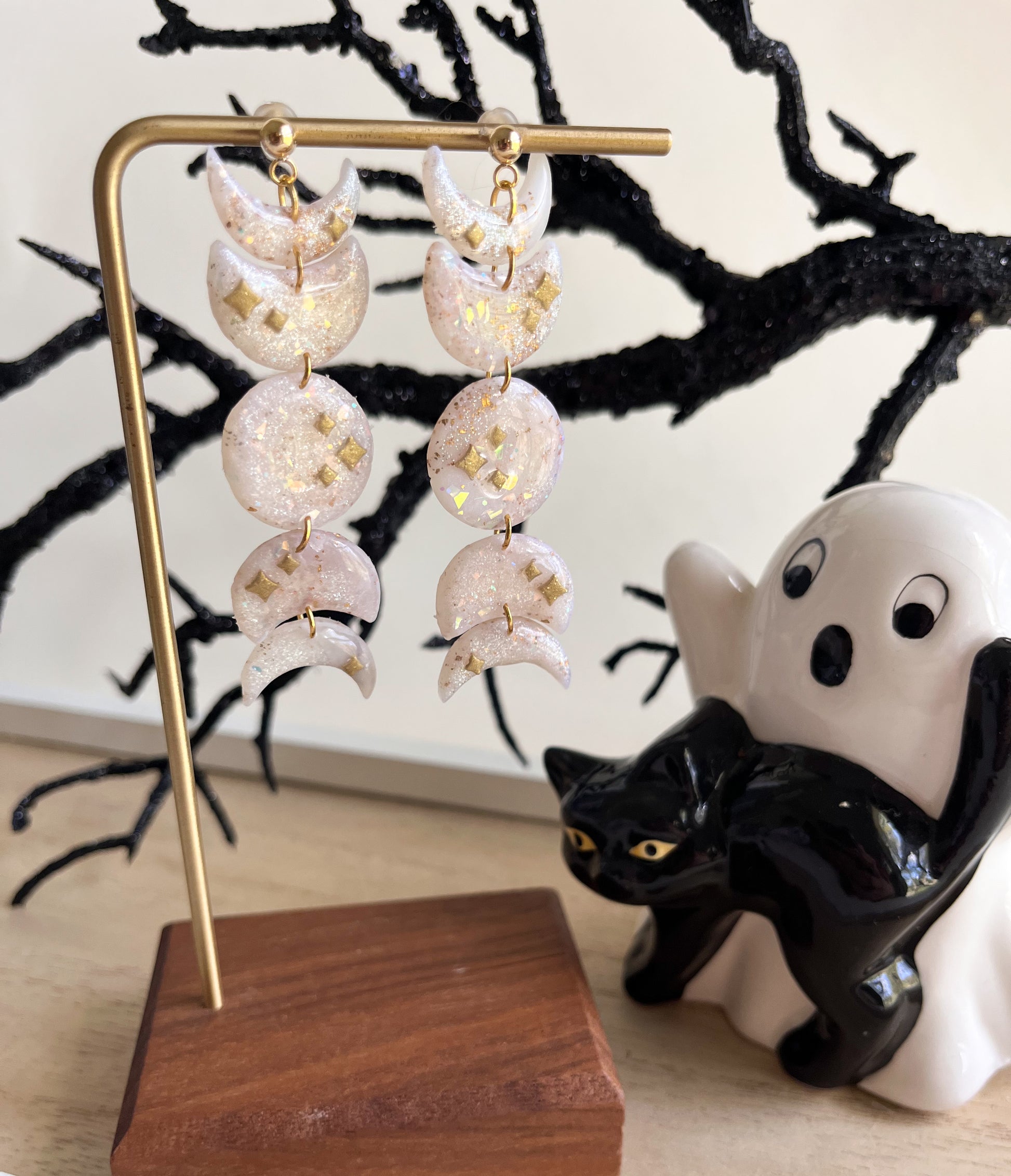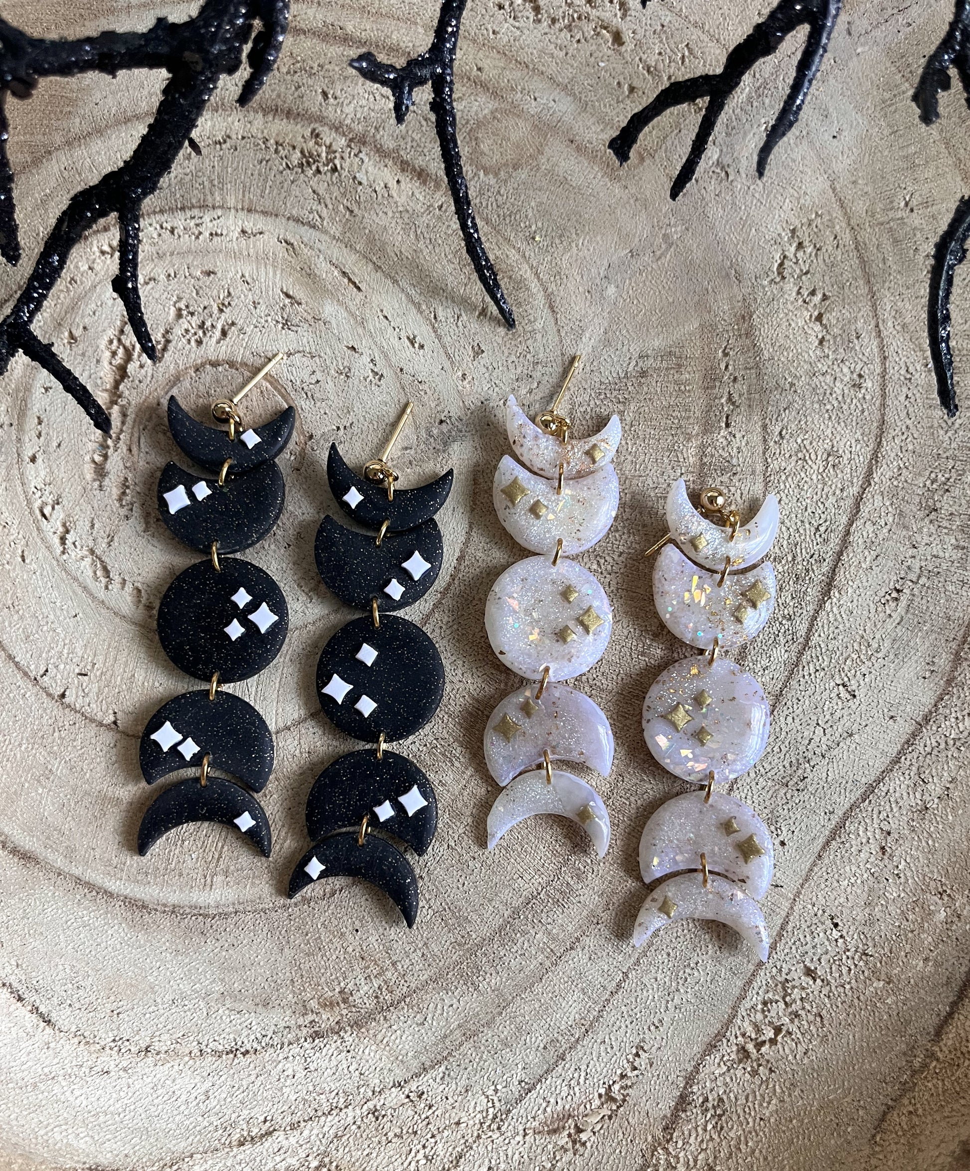 Beautiful lunar phase earrings that feature a unique, marbled, opalescent design with gold accents and a layer of resin to help them shine. Just a heads up, due to the marbled nature and the process of creating these earrings, no two pieces or pairs will look the same. The earrings you receive will vary but will all be equally beautiful!