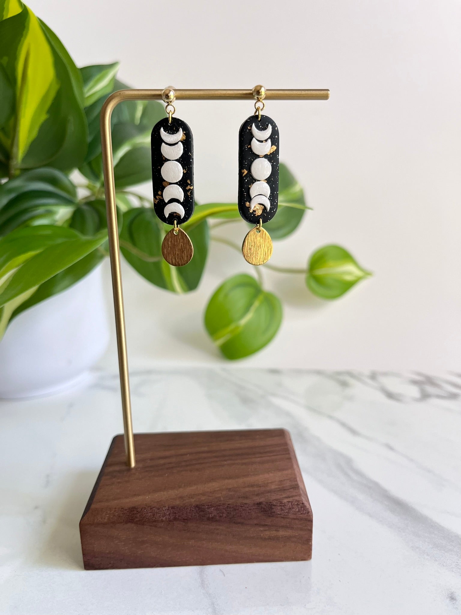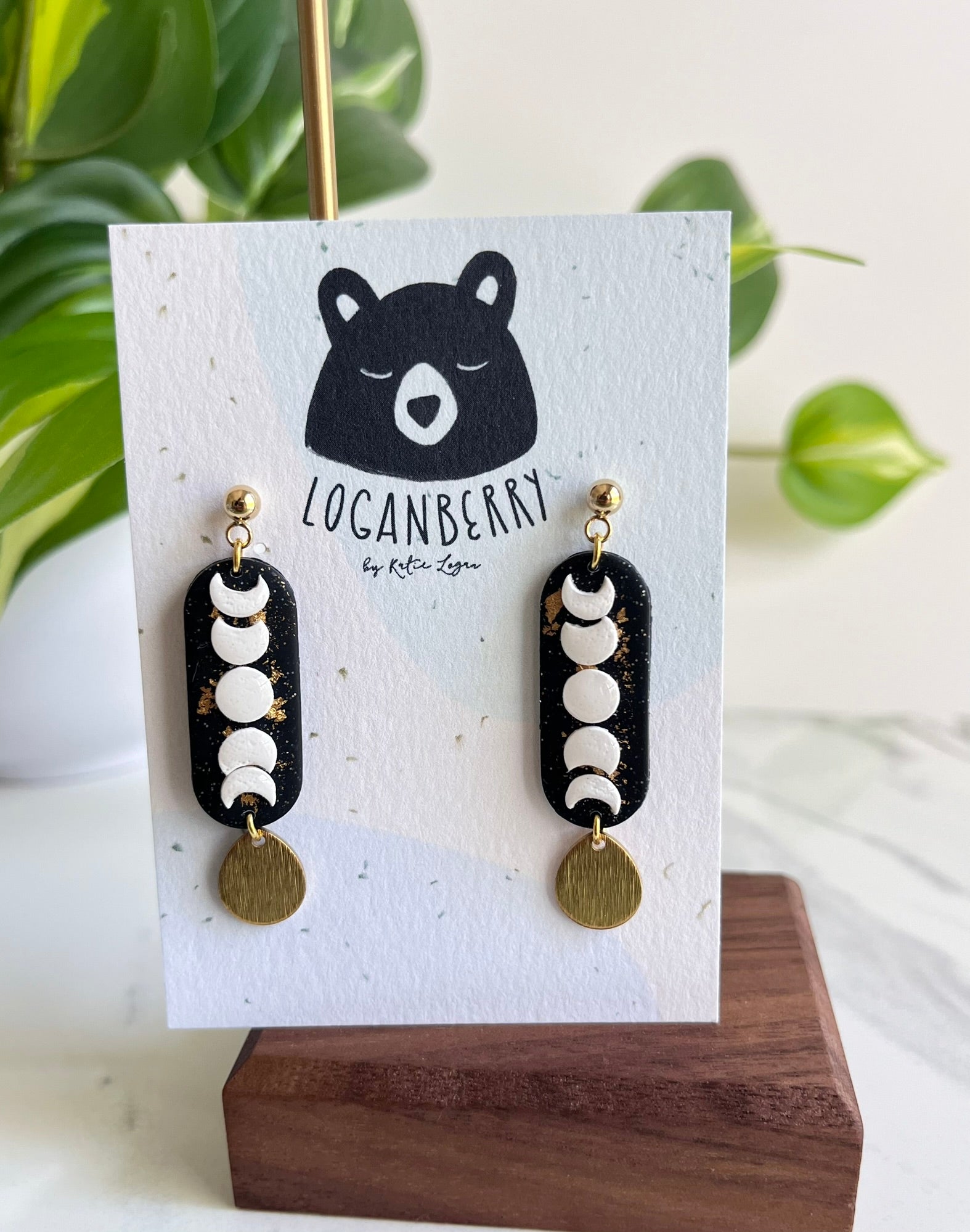 Dainty moon phases on a black and gold background, a resin coating on the moons helps them shine, featuring a brass tear drop for some extra flair.