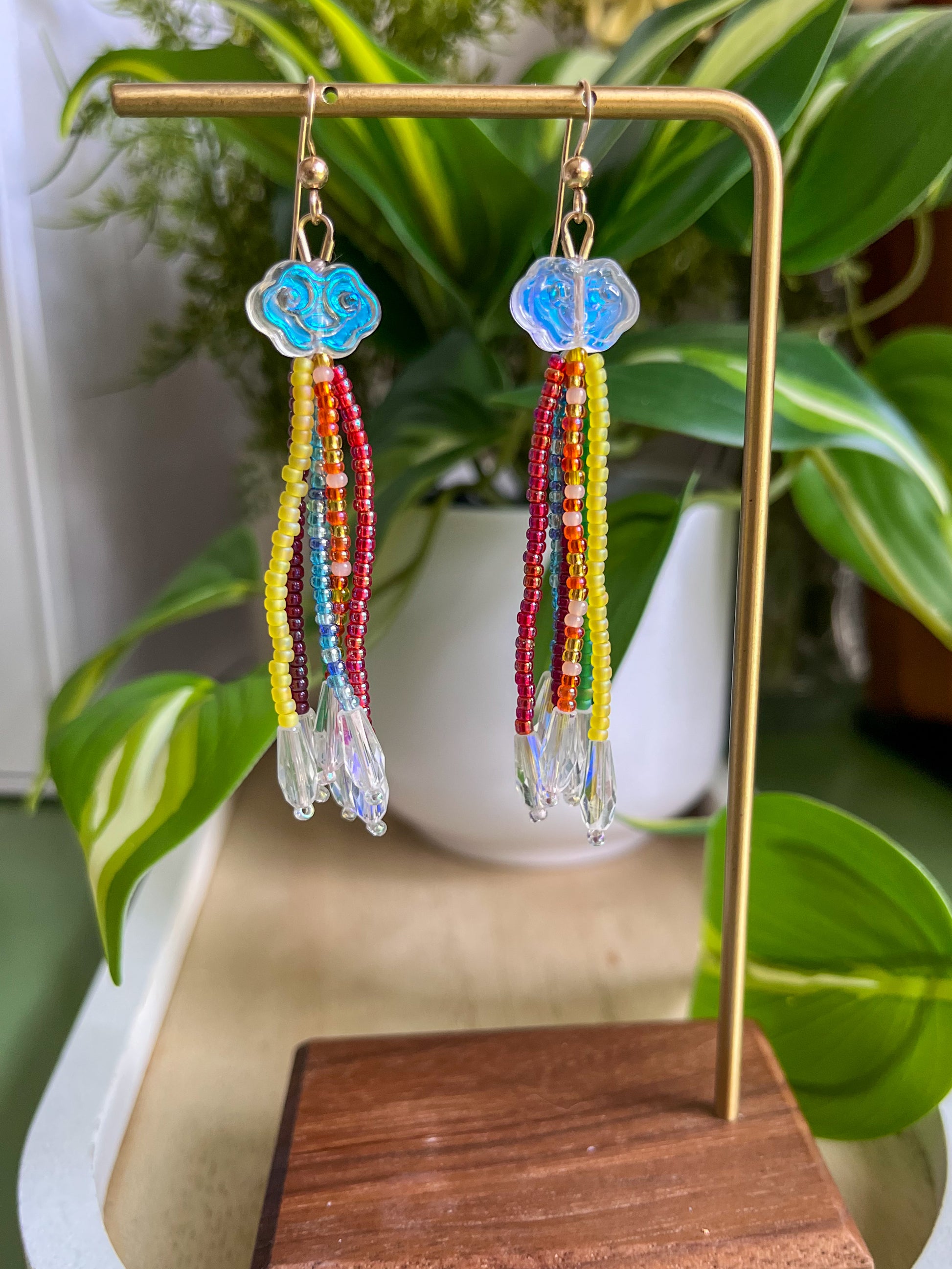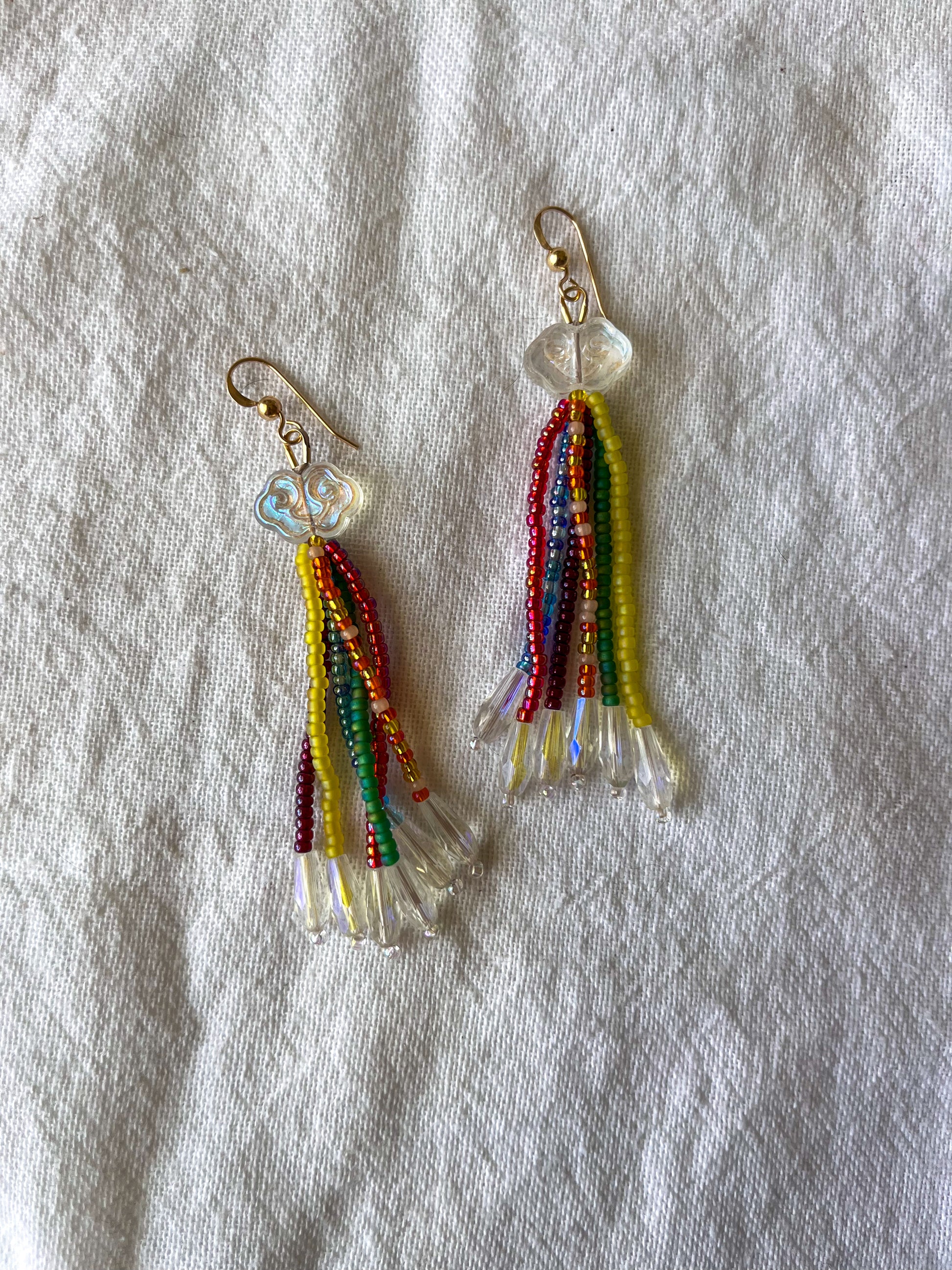 Cute iridescent clouds with rainbow fringe. Ear hooks are gold filled.